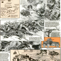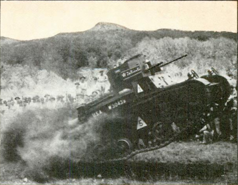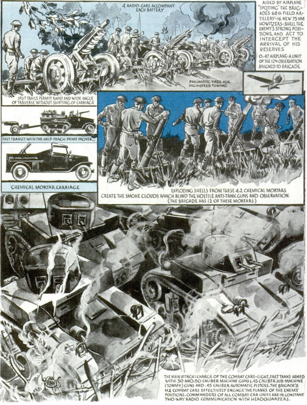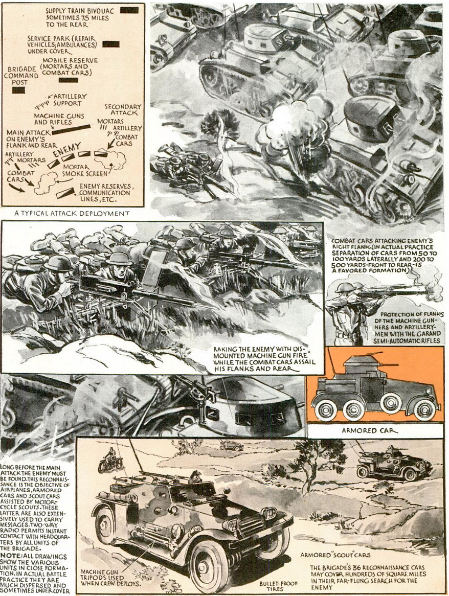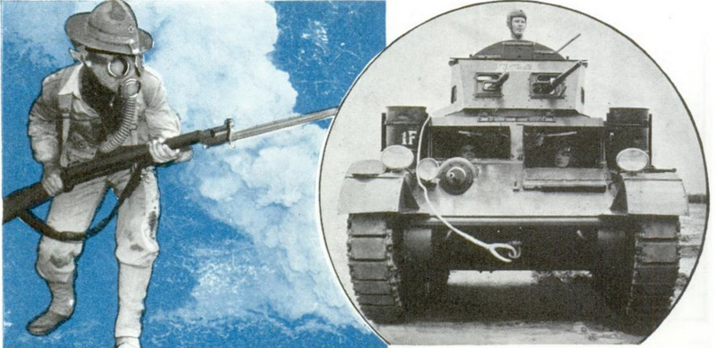TANKS on the ground, plants in the sky, pig boats under water; radio direction finders, mechanical fire-control computers, automatic rifles - it's a machine age in war as in peace. Many of us are inclined to make the rash conclusion that war today is entirely an affair of machines - with robots taking the place of flesh and blood. Nothing could be farther from the truth. War is waged by men; men drive machines. Mars is simply utilizing the latest in mechanical developments as he has since the first caveman found that by rushing on his opponent, stick or stone in hand, he could do better than by walking slowly at him, barehanded. That first caveman didn’t know it but he was utilizing the basic elements of mechanics - force and motion. Ever since that time men have taken advantage of mechanical contrivances on land and sea. Invention of the wheel was the first step toward the earliest form of tank, the chariot. The sling, the bow, the arbalest, the ballistae hurling great rocks, later gunpowder, ushering in firearms - all of these things are machines, some invented for use in war, others adapted to it from pacific uses. And for each new invention in offensive, each improvement in the art of war, man in turn invented something to defend himself against it, from the shield of hide to the armor plate, from the simple shelter of a tree or hummock to the Maginot line and the Westwall. Fire and movement, striking power and mobility are the aids mankind has been seeking since that first caveman’s rock-implemented rush. The two things are diametrically opposed. The Roman short sword stopped the Greek phalanx, the British longbow the armored knights of France. The machine gun’s stutter sounded the knell of cavalry's earth shaking charge. Armor and armor-piercing projectiles have vied with one another since before the invention of steel. And now the perfection of the motor vehicle has brought into being the mechanized forces - troops that fight from moving vehicles, differing from the hide-armored, scythe-armed, arrow-shooting chariots of ancient history only in degree of human invention. The fight between fire power and mobility has alwavs brought about a compromise, for the faster the movement, the less protection can be carried. Conversely, the heavier the protection, the more massive the weapon, the less the speed. In our own Civil War railroads were prime factors for mobility too in the Austro-Prussian war of 1866. By the time of the World War, fire power - the long range punch of artillery, the deadly hail of the machine-gun bullet - combined to halt mobility. Then came the tank, as compromise, for it combined to a certain degree mobility and fire power or striking power. Today an improved tank, with increased mobility as well as increased fire power, is in the field. And already its Nemesis has appeared - the anti-tank gun. Last September, Poland was eliminated as a combatant because the German invasion disrupted the entire economic structure of the nation; destruction of Polish armed forces was of secondary importance and a logical conclusion once the industrial heart of the nation was penetrated. This was accomplished by use of mechanized forces which, being mobile, dashed ahead at top speed, and, having fire power or punch, brushed aside local resistance. Foot troops, infantry, able to hold the terrain dominated by the mechanized thrust, followed fast. And foot troops, armed men on the ground, are the decisive factors in war. Perhaps the most brief, the most illuminative word-painting of what this all means is the homely language of General Nathan Bedford Forrest, of the Confederate Army, who expressed all the principles of war in this remark - “Git thar fustest with the mostest men.” This can be done in two ways - by using transportation to get troops onto the field of battle, when they must then dismount and fight on the ground, or by using the vehicles not only for transport, but as actual fighting platforms. Today we call the first motorization the second mechanization. The words do not mean the same thing. The basis for mechanization is of course the cross-country vehicle, which by one of several ingenious devices, most of them adaptations of the so-called Caterpillar tread, or endless-chain track, can cover ground which an ordinary wheeled vehicle cannot cross. Mechanization began with the World War tank, a cumbersome armored tractor which lumbered across country at the pace of walking infantrymen, protecting them in its advance, crushing machine-gun nests, knocking down barriers, crossing ditches and trenches. Today tanks, both light and medium, which can in theory make forty miles an hour or more, are still the basic vehicles of mechanized forces. We say “in theory” because in fact a vehicle of this type crossing rough terrain is limited more by the human element than by its traction. One must remember that in action the driver, completely enclosed, has most limited vision. How fast would you drive your auto, on the road, if your only observation was through narrow eyeslits? Multiply this by the obstacle-dodging necessity of cross-country driving, and you will realize that only under most exceptional circumstances, on smooth ground, could extreme speed be kept up. The heavy tank or “land battleship,” is a special weapon for special circumstances, such as a break-through on a stabilized front, and has been discarded by some nations. Armor used on tanks covers only the vital parts, and is not all-round, hence tanks are more vulnerable on top and bottom. Again we see the conflict between the two opposed factors of mobility and fire power. It might be possible to build a tank which would be impervious to anything but heavy artillery projectiles; when you do this, however, you instantly slow up its speed out of all proportion. A nearly motionless tank cannot carry out its mission. Light, medium and heavy tanks have two uses - accompanying, that is, moving with their in
