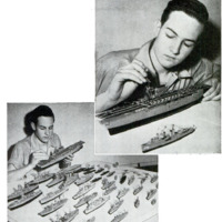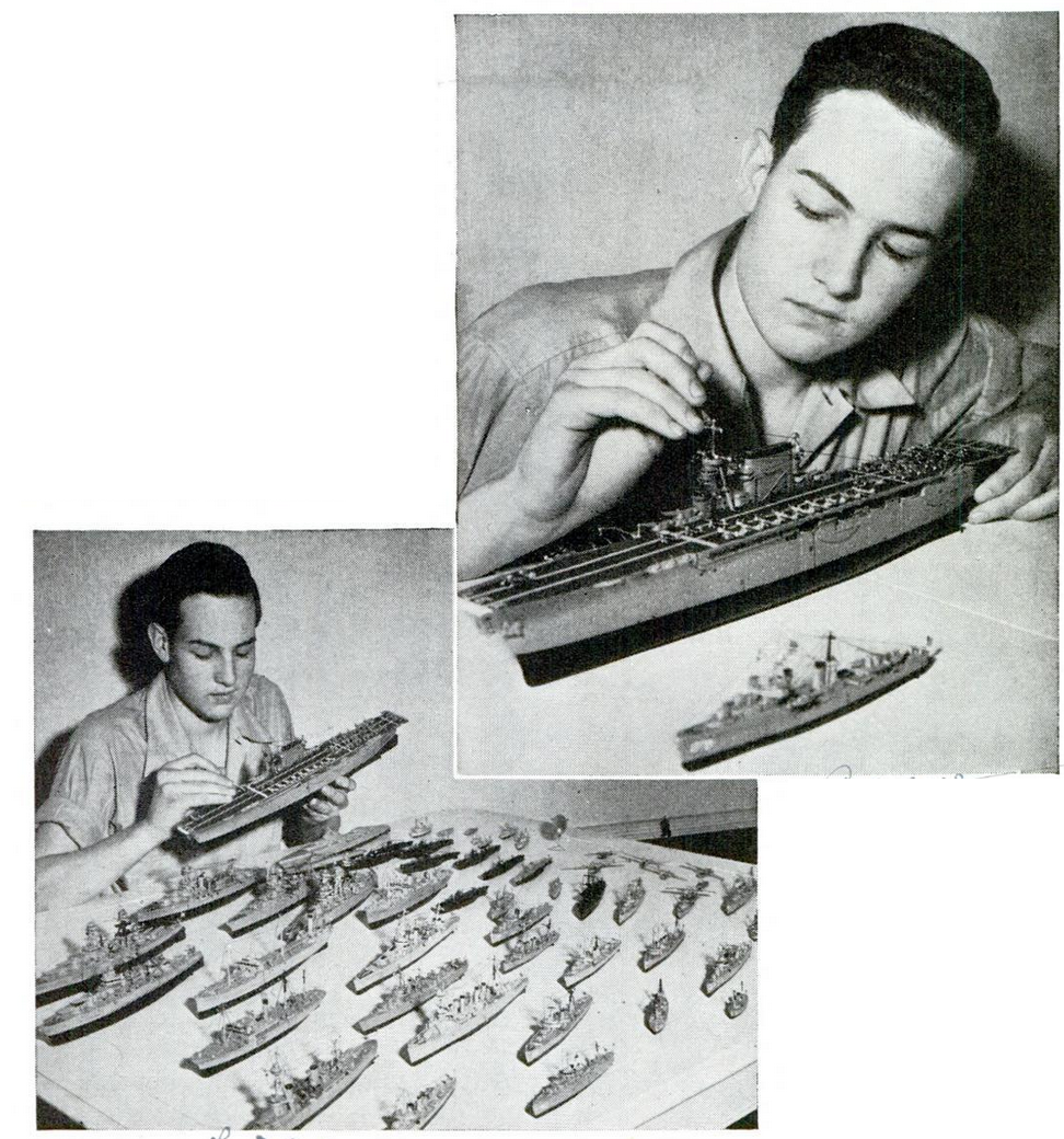 Seventeen-year-old William Tompkins of Hollywood high school has-a good start toward a two-ocean navy. For more than three years he has been whittling model ships from balsa wood, and today has a navy of 52 vessels. His tools were razor blades, pliers and jack knife, his materials balsa and Strips of sheet aluminum. The models cover a wide range of types, including dreadnaughts, cruisers, destroyers, submarines and small surface craft, all carved accurately to scale. The largest vessel in the fleet is a model of the aircraft carrier Lexington.