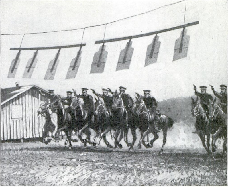 Cavalry officers in the United States army are required to be skillful marksmen with the pistol as well as with the saber, and to receive the proper training under conditions as nearly like those in action as possible, target practices during charges are held. As a line dashes toward a string of overhead targets, the student officers draw their weapons and fire at a specified signal. The stunt develops quickness of eye, accuracy of aim and ease in firing from galloping horses.