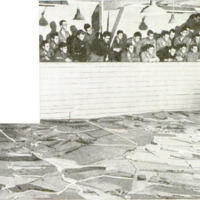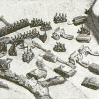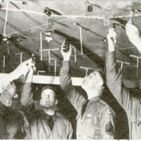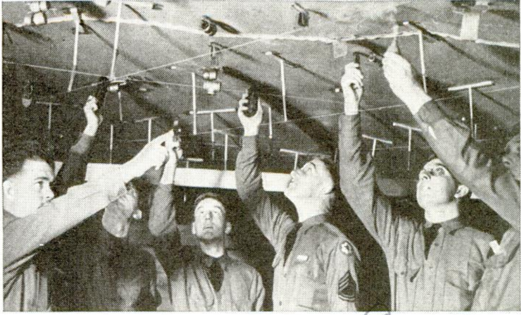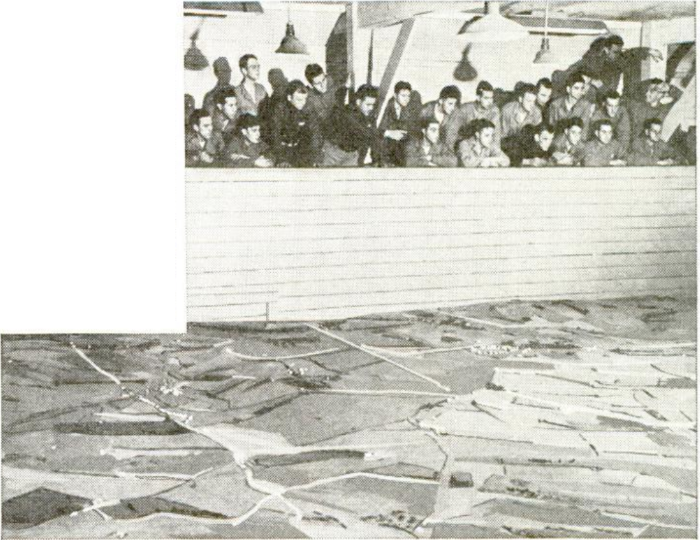 Brought to the United States from England, a miniature of a stretch of English countryside, reproduced on canvas, is being used by army officers studying tank tactics at the armored force school at Fort Knox, Ky, It represents an 8-by-13-mile section of Salisbury, Wiltshire, with woods of sponge rubber, Lilliputian farm houses, and plowed fields depicted in water colors. Rolling knolls of England’s pastureland are reproduced by the upright sticks that support the 24-by-38-foot canvas at a height that will permit men to walk beneath it. Distributed at strategic points on the canvas are tiny models of tanks, artillery, motorcycles and troops; and five men stand under the canvas holding magnets. As an officer describes a problem for the class, the men contact designated spots with their magnets, moving the various army units about the canvas as the fight progresses. Bursts of artillery fire are simulated by ejecting cigarette smoke through openings in the canvas. Student officers sit on a narrow balcony above the map.