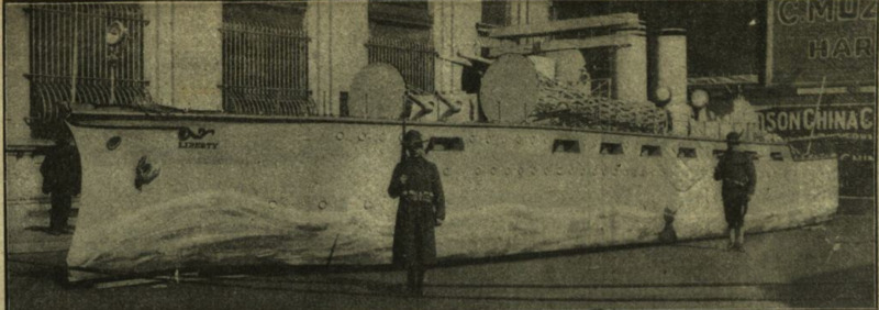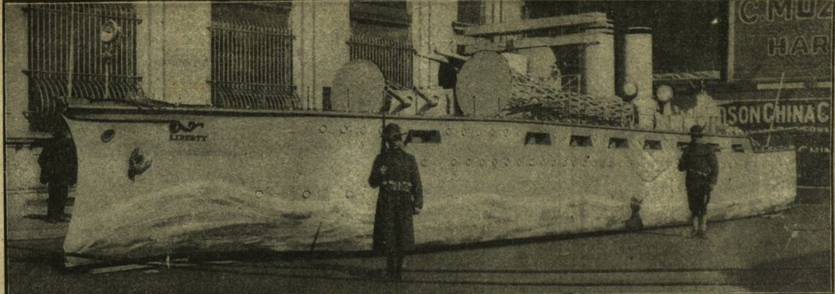 Mille mezzi originali escogitano gli americani per il loro Prestito della Libertà. A Hoboken è stata costruita, a scopo di propaganda, una perfetta ricostruzione di «dreadnought» che funzionerà da ufficio di vendita delle cartelle del Prestito.