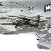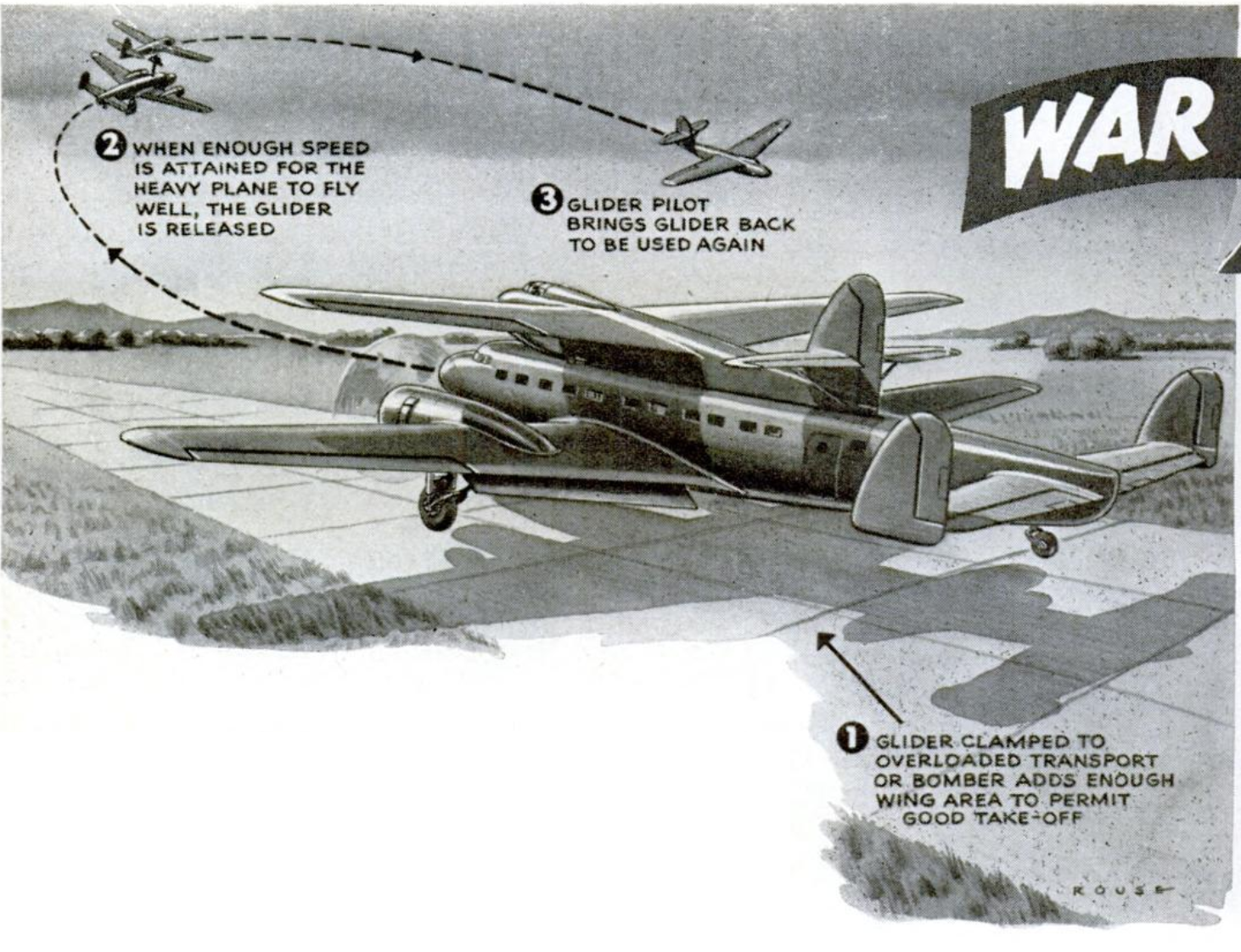 PICKABACK GLIDERS that would lend heavily loaded bombers and big transport planes additional wing surface and so help them, during the take-off, to get into the air faster, have been proposed by Vadim S. Makaroff, of New York. As soon as the big plane has reached a safe altitude, the glider detaches itself and returns to the airdrome.
