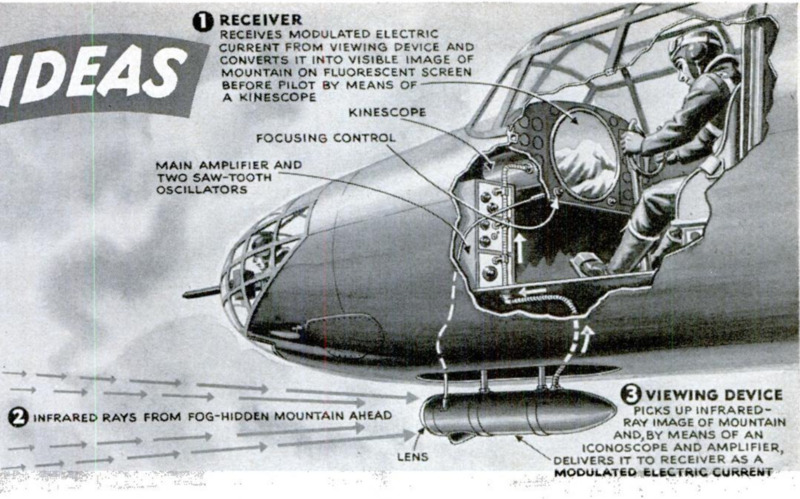 SEEING THROUGH FOG is made possible for pilots by a novel application of television principles. A viewing device slung under the nose of the plane picks up fog-piercing infrared rays which are not visible to the human eye. An iconoscope translates this ghost image into electrical impulses, which are amplified and passed on to a receiving unit where they are converted into a visible image on a fluorescent screen. In addition to removing the hazard of running into a mist-shrouded mountain, the device would assist in landings. Harold A. Adams, of Bakersfield, Calif., is the inventor.
