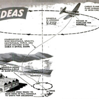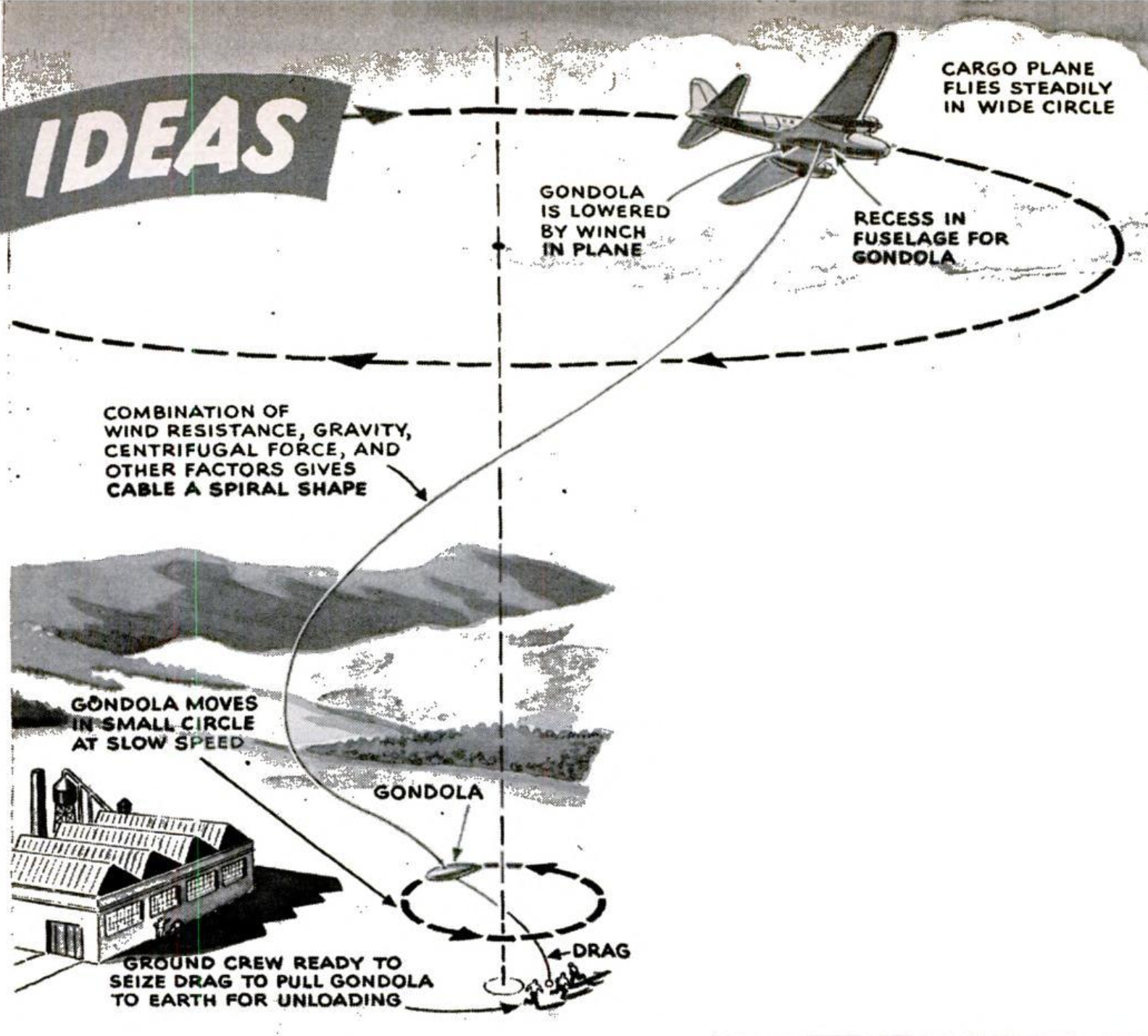 AIR DELIVERIES and pickups that can be made while the plane circles overhead are proposed by Verne R. Anderson, of Tucson, Ariz. A streamlined gondola is let down from the plane by a cable. As the length of the cable increases, the gondola tends to describe a diminishing circle at a progressively slower speed. When it is close to the ground it automatically lets out a small cable at the end of which is a rubberlike weight. Coming into contact with the ground, the weight acts as a drag, which further slows down the movement of the gondola and enables the ground crew to haul it down to earth by the small cable. After it is loaded—or unloaded, as the case may be—the gondola is released and pulled up by the plane, which then proceeds to its next destination.