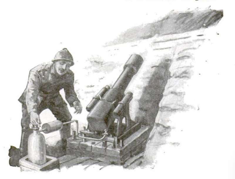 ACETYLENE gas does not work well as an engine fuel. It is too explosive. However, a Paris inventor, R. A. Brevaire, would turn this to good use. The lower part of his machine consists of a chamber into which air is forced under pressure, or sucked in by the rush of an outgoing shell. Having thus filled the chamber with air, the operator next admits a small quantity of acetylene gas by means of a valve. Air and the gas intermingle forming a highly explosive mixture. This is set off at will by means of a spark plug and a suitable coil. Shells are inserted in the gun by dropping them through the muzzle, rear-end foremost. If the gun-barrel is unrifled, wings at the base of the shell make it spin and fly true. A sound-deadening chamber is fastened to the outer end of the gun; it is built on the principle of an automobile muffler. This gun is new in being the first trench gun to use gas as an explosive.