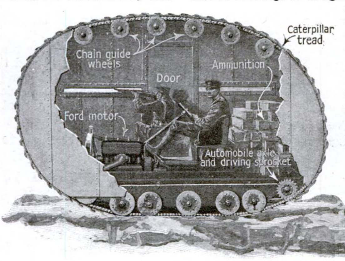 It has been rumored that these tanks will be more like giant wheels than the familiar elongated British tanks. Hence they may resemble the tank shown in the accompanying sketch, in which the caterpillar treads are run completely around the circumference of the wheel, the inner portion of the wheel being armored and remaining stationary.