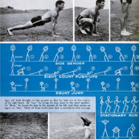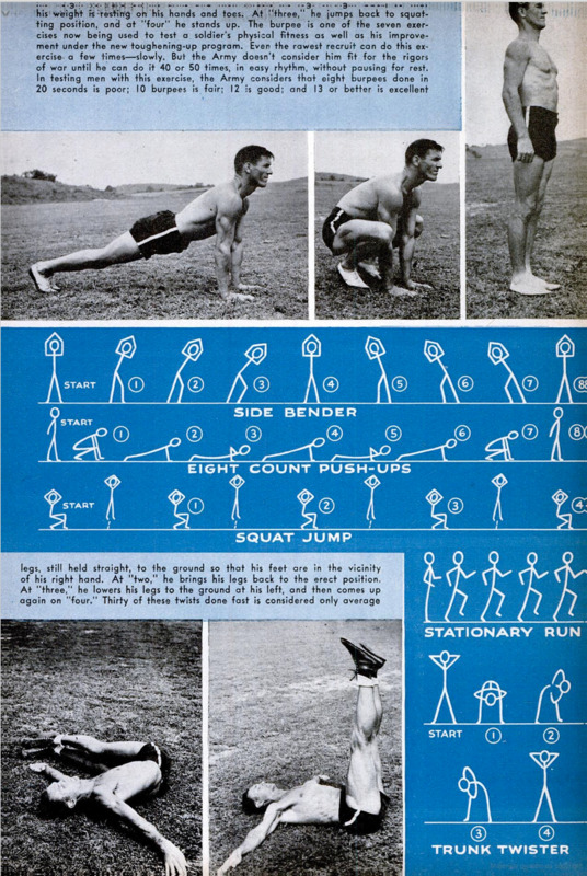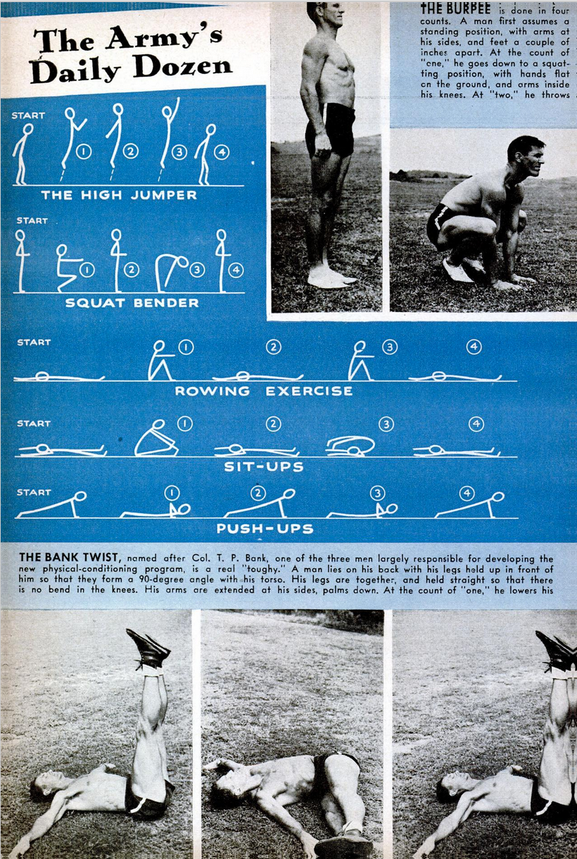 As for strength and agility needed in hand-to-hand combat against such toughened troops as the Nazis, no powers are too great. It was with such situations in mind that the three university athletic directors went over scores of standard drills in calisthenics to develop the single set of 12 that is now working miracles for the Army. They packed into a dozen basic exercises, which can be run through in 20 minutes, more strenuous physical drill than was contained in the 60-minute system used before the war. Then they added “guerrilla” exercises and combative drills, and topped their new system with rough-and-tumble games to build competitive spirit among our troops.