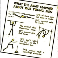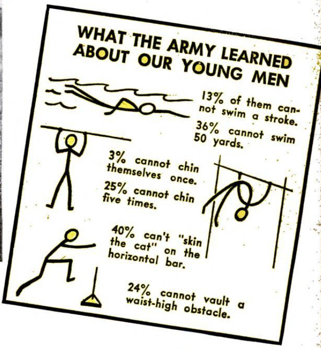 “In a physical-fitness test of 1,000 men at the University of Illinois in 1940,” he said, “the following facts were revealed: 13 percent of them couldn't swim a stroke and 36 percent couldn't swim 50 yards. Over three percent couldn't chin themselves even once, and more than 25 percent couldn't chin themselves five times. About 24 percent couldn't vault an obstacle waist high; more than 40 percent couldn't ‘skin the cat,’ an easy stunt for their fathers.”