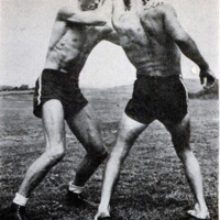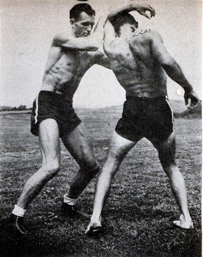 Besides the calisthenics, there are drills in which men of approximately the same weight and height may be pitted against each other, individually or in teams. The very names of these describe what they do. They are the hand wrestle, the pull-hands, the wrist bend (or make-'em-beg), the head push, the shoulder push, the back-to-back push, the knock-em-down, and others.