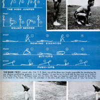 In the high jumper, for instance, the men swing their arms from their sides to above their heads and jump straight up, at least a foot into the air. Then they swing their arms forward and jump in that position, then backward and jump. This is done in rapid cadence, from 12 to 25 times before the men pass on to another exercise at a single command, and without any intervening rest.