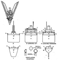 For the superstructure, rabbet the underside of H to hold G. Portholes are drilled in D, F, and H. Thin strips of paper protect the gun platforms and serve for bridge and stair rail. Masts are inserted into the mast houses N, as are the wire booms, which are then bent to proper angles. Each unit is glued to the hull after it has been painted. Ventilators may be made by cutting whole allspice in half, removing the centers, and mounting the half shells on bits of toothpicks, or metal ventilators may be used.