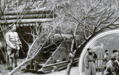 - Caption: "Heavy French siege gun hidden by brush from German aerial scouts. When an aeroplane approaches the crew hides in the dugout".