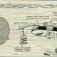SUBMARINE KILLER. Shark Carries High Explosives In Tank Strapt to His Back. Extensiom Beam Carrles Fish-Balt in Front of His Nose. This Makes Him Speedy Trying to Catch Fish. Inverted Marine Glasses Make Submarine Appear Like Small Fish. He Rushes for It-Contact Nose Piece Operates Spark Coil, Which Blows Up the Tank, Sub., Shark and All. Inventor, John P. Buckley, Washington, D. C.