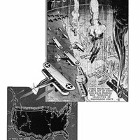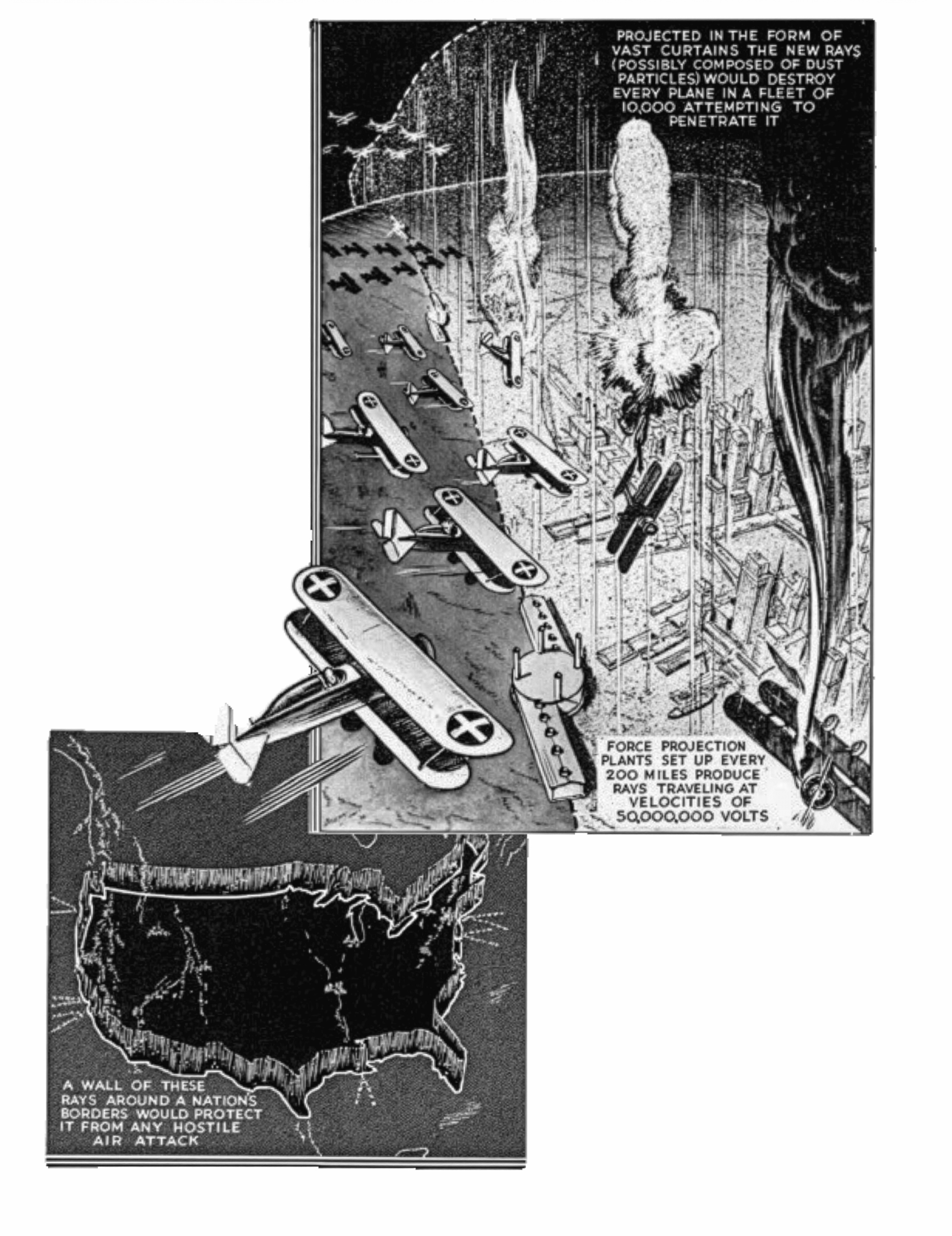 These rays, he said, would be made of particles, possibly dust of some sort, microscopically fine, driven electrically and projected into walls miles high and 100 miles each in length. The particles would travel with the unheard of velocities of 50,000,000 volts. Ten thousand planes flying into one of these curtains would all be destroyed, the inventor averred, and visioned force projecting plants set up every 200 miles along a nation's borders, each shooting rays 100 miles on either side. Tests of this form of defense are said to have proved successful when several planes flying into such a curtain were forced to land through engine failure. The dust beams would shoot in straight lines and it is said complete and permanent engine failure results when the particles are "breathed" by the motors of a plane. Anti-aircraft guns could project the dust curtains.