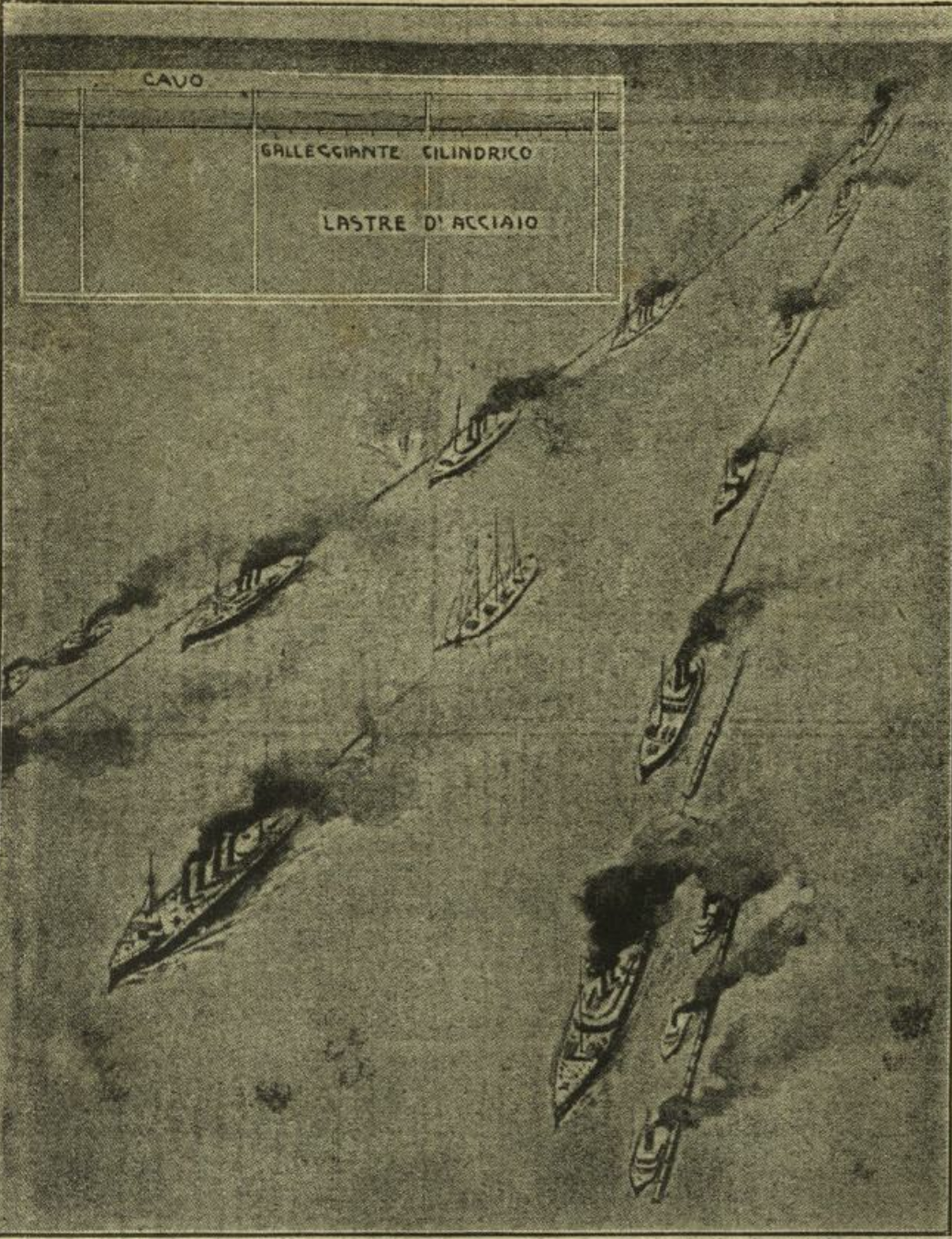 Continuiamo ad illustrare le più interessanti proposte per la lotta contro i sommergibili. Questa volta si tratta di proteggere con delle lastre d'acciaio le navi mercantili. Facendo rotta nella formazione che il disegno mostra e ciascuna rimorchiando un e "muro" d'acciaio, le navi si proteggerebbero l'una l'altra contro i siluri. Come dovrebbe essere ciascun "muro d'acciaio", si vede nel diagramma in alto.