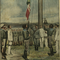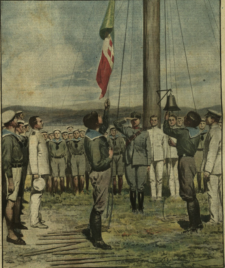 - I Giovani Esploratori al mare. La solenne cerimonia quotidiana dell'alzata della bandiera, al levar del sole, nel campo degli Esploratori Marini nel torrione del Varignano che domina le difese della Spezia.
