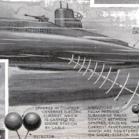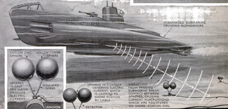 A SUBMARINE DETECTOR devised by the late Vladimir S. Goloviznin, of New York City, employs electro-chemical action to give warning of enemy undersea craft operating near the coast. Detector units, anchored in shallow water offshore, consist of pairs of hollow spheres of dissimilar materials which generate an electric current when in contact in salt water. The vibrations produced in the water by a passing submarine cause current fluctuations which are recorded on instruments ashore.