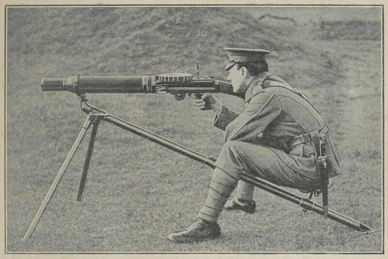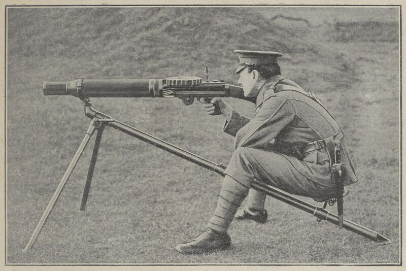 - Caption: "Le ttireur est assis sur un selle coulissant sur le tube postérieur du trépied; l'arme est fixée à l'extremité de ce tube au moyen d'un collier mobile qui permet le variations de l'angle de pointage."