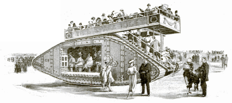 Tanks are usually associated with rides more sinister than joy rides. But here is a tank that has been equipped to provide space for passengers who desire to travel over smooth and rough places in one of these capable though clumsy vehicles. A platform has been arranged for the top of the tank, thus increasing its space for passengers