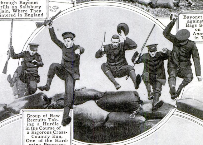 - Caption: "Bayonet practice against straw bags scattered on ground, another step in training".