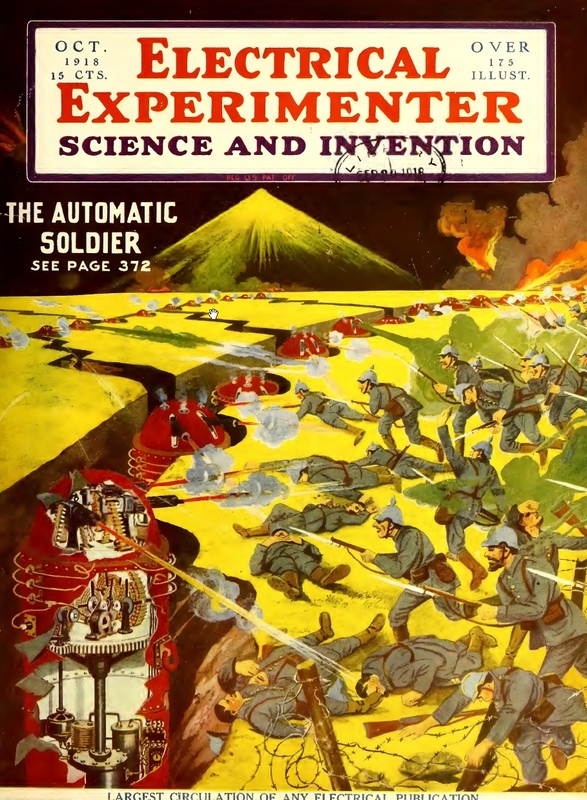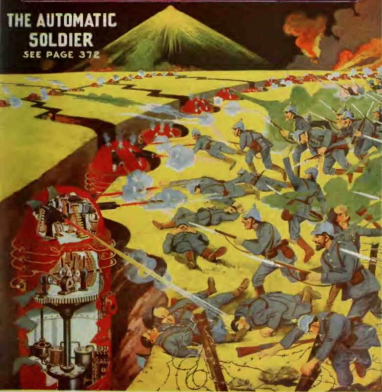 Il “Soldato Automatico” è un buon esempio di un tema ricorrente nelle riviste di divulgazione: la guerra del futuro sarà combattuta tra macchine. L’Electrical Experimenter suggeriva che il dilemma delle trincee potesse essere risolto semplicemente sostituendo i soldati con torrette controllate senza fili tramite onde radio. Armate di tre mitragliatrici, lanciafiamme e gas, le torrette potevano ritrarsi nel terreno quando non utilizzate. Naturalmente, come mostrato nell’illustrazione, perché l’invenzione funzionasse i soldati tedeschi dovevano restare umani.